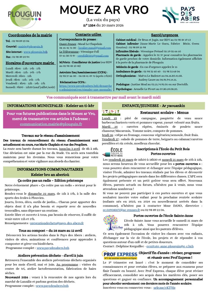Ce samedi s'est tenue la séance d'installation du nouveau conseil municipal. Christine Saliou a été élue maire avec 19 voix pour sur 19. L'écharpe tricolore lui a été remise par Bertrand Le Bris , doyen de l'assemblée. La liste d'adjoint présentée par Olivier Marzin a été élue à l'unanimité. Olivier Marzin : Adjoint au Maire délégué à l'aménagement urbain, à la vie économique et à la transition écologique Aurélie Kerjean : Adjointe au Maire déléguée aux affaires scolaires, à l'enfance et à la jeunesse Frédéric Paul : Adjoint au Maire délégué à la communication, à la participation citoyenne, à la dynamique associative et culturelle Patricia Perrot : Adjointe au Maire déléguée à l'action sociale et au bien vieillir Daniel Conq : Adjoint au Maire délégué aux finances, aux batiments et aux travaux Sylvia Brimbeuf : conseillère Municipale déléguée à l'action sociale et au bien vieillir