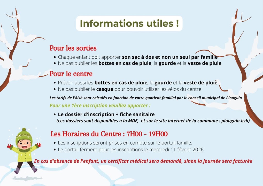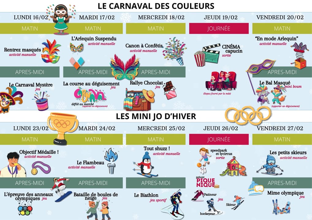 Carnaval & JO : des vacances dhiver 100 % fun à la Maison de l'enfance ! Les vacances dhiver arrivent et un programme ludique, festif et sportif attend vos enfants ! Semaine Carnaval Déguisements, couleurs, confettis, défilé et mini-boum pour faire le plein de bonne humeur ! Semaine JO dhiver Défis sportifs, jeux, esprit déquipe et objectif médailles Activités, sorties et surprises pour des vacances quils ne sont pas prêts doublier ! Pensez à inscrire votre enfant dès maintenant